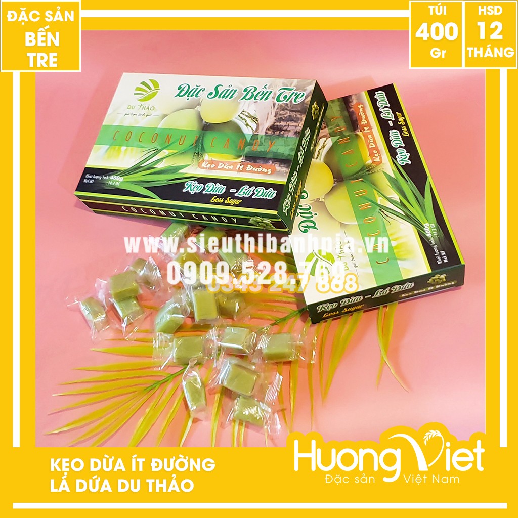 Kẹo dừa lá dứa Du Thảo được làm từ nước cốt dừa nguyên chất kết hợp cùng đường mạch nha và lá dứa tạo nên những viên kẹo thơm ngon và hấp dẫn đậm chất Bến Tre. Ngoài ra, loại kẹo này có lượng đường vừa phải nên phù hợp với nhiều đối tượng (kể cả những người đang ăn kiêng).